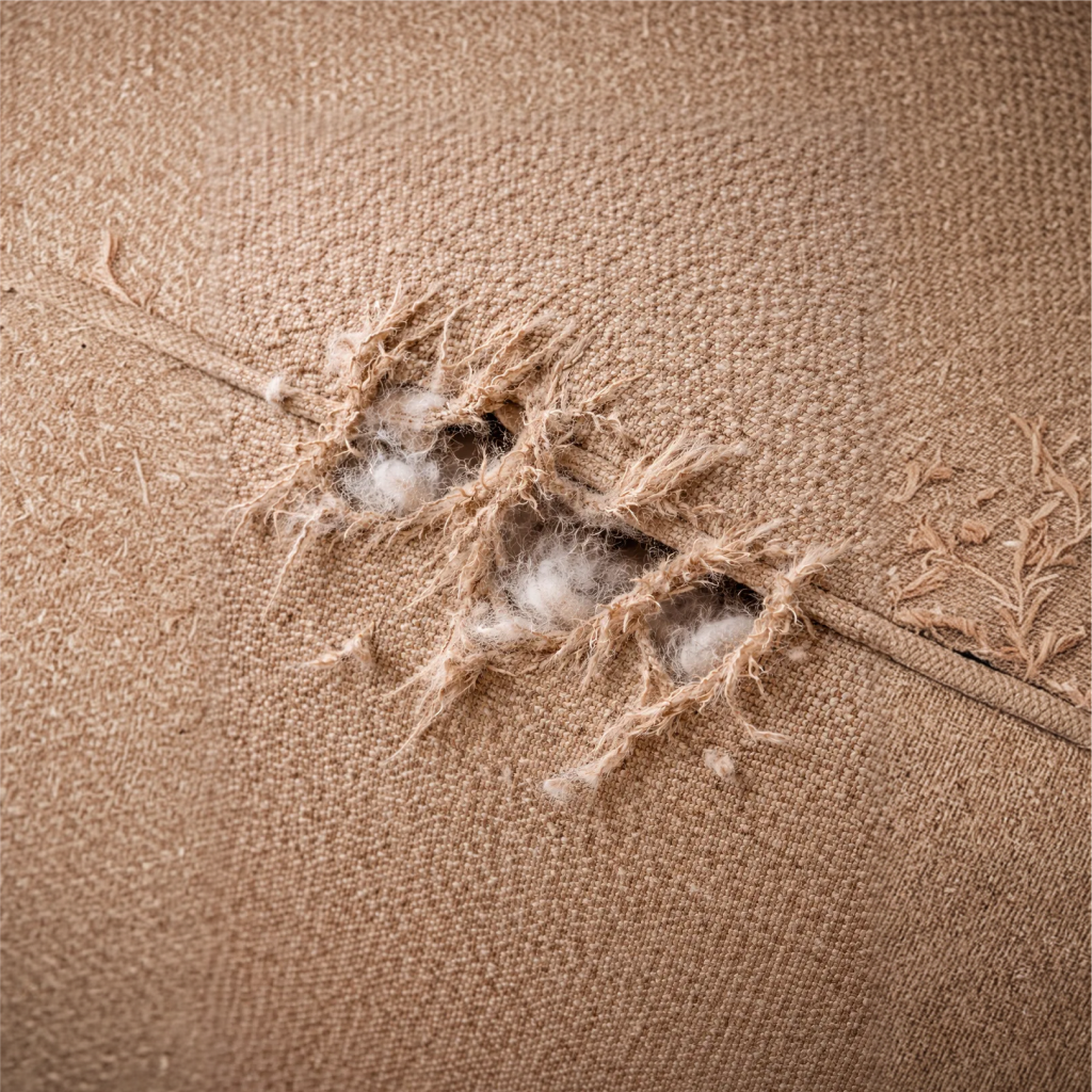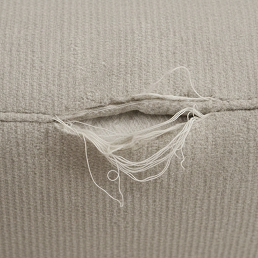 Tears, pulls, or worn-out areas.